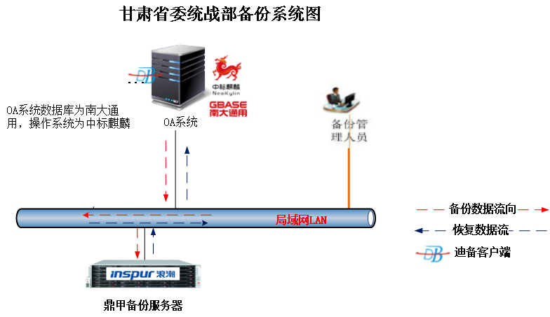 在甘肅省委統戰部OA系統上部署鼎甲迪備備份容災軟件客戶端,備份服務器及存儲介質由一臺浪潮服務器組成,針對國產中標麒麟操作系統、國產數據庫Gbase(南大通用)數據庫分別進行全量備份、增量備份。實現對于OA系統完整的保護。