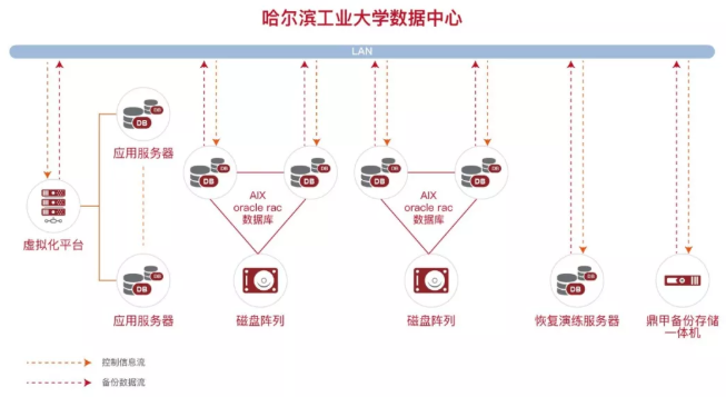 鼎甲結合哈工大的數據保護需求,提供基于鼎甲備份存儲一體機(InfoKist)的解決方案。對哈工大重要業(yè)務系統(tǒng)的Oracle RAC數據庫實行時間策略每周全量、每天增量的自動化的全面高效的在線熱備份。對VMware虛擬機實行時間策略每周全量備份、每周增量的自動化的全面高效的在線熱備份。