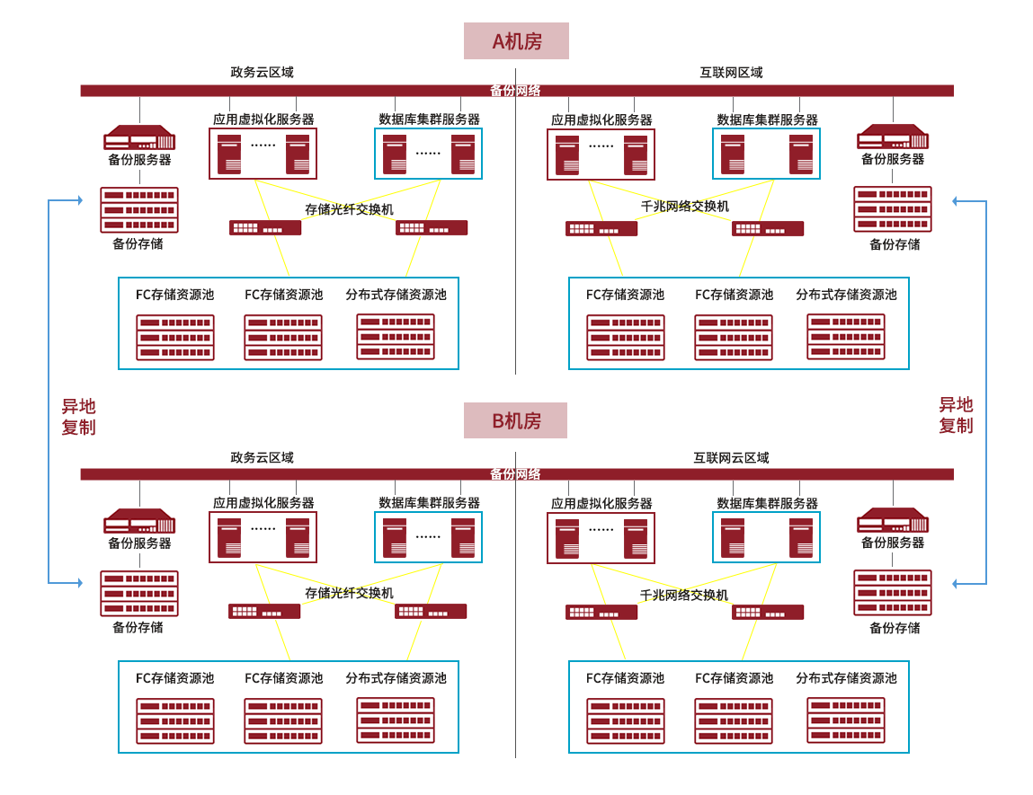鼎甲在廈門電子政務云A、B機房的政務外網區和互聯網區分別部署了本地備份系統,提供給互聯網區域、政務外網區域共300TiB的存儲容量,實現各自政務外網和互聯網區本地數據備份保護。且兩地各網絡區域之間備份系統通過專線互聯,實現了備份數據異地復制和異地存儲。