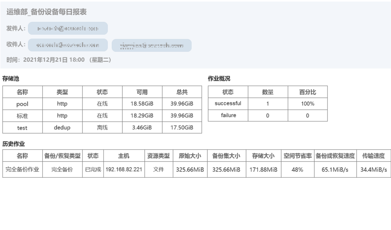 自動發送運維郵件是系統每天自動生成一份關于作業概覽、存儲池狀況、歷史作業等數據的運維報表,每天定時自動發送到單位各部門指定郵箱,向各部門反饋即時運維情況,有利于運維人員全面掌握備份作業、資源運維狀況等,確保備份恢復運維工作有條不紊進行。