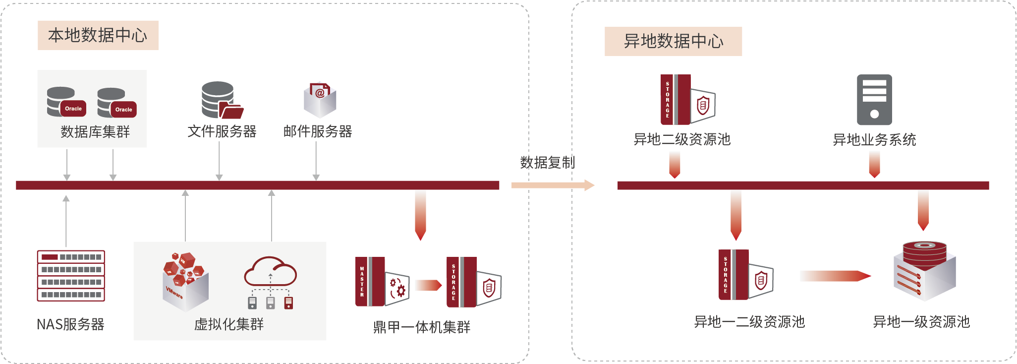 整體方案部署了18臺備份一體機,單臺容量達300TB,現已實現3PB數據的集中備份。通過鼎甲的數據備份平臺對中行的數據進行備份,在備份之后的數據通過一對一的復制鏈路,實現主信息機房到方山容災機房的數據級容災。
